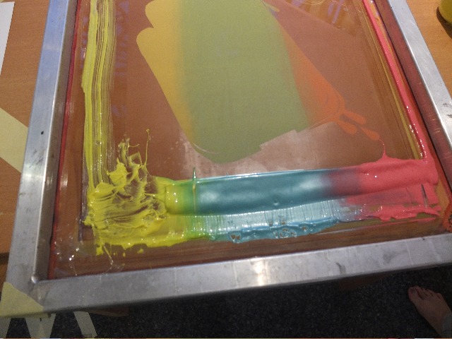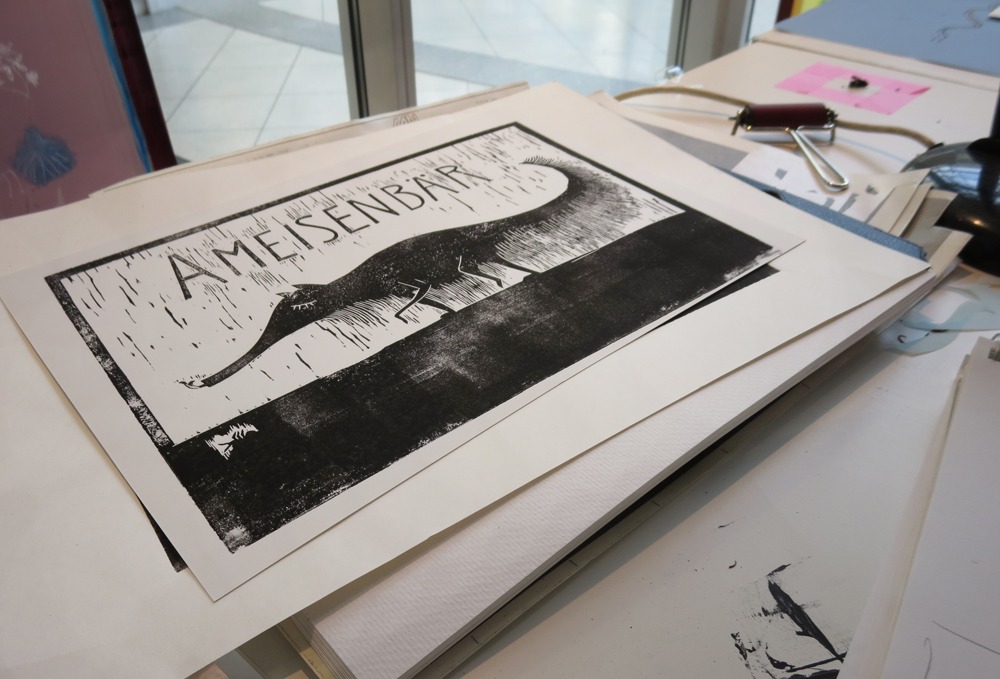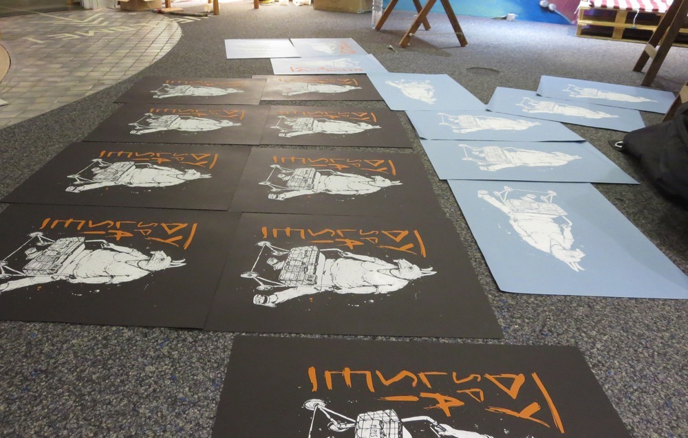 Die ganze Woche arbeiteten die Gestalter vor Ort, illustrierten, druckten, es entstanden Siebdrucke, Linolschnitte, Holzschnitte stellen aus. Am 1.8. waren die Ergebnisse in einer Ausstellung im Rahmen des Programms August im August zu sehen.