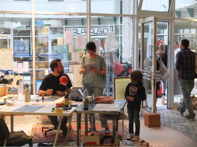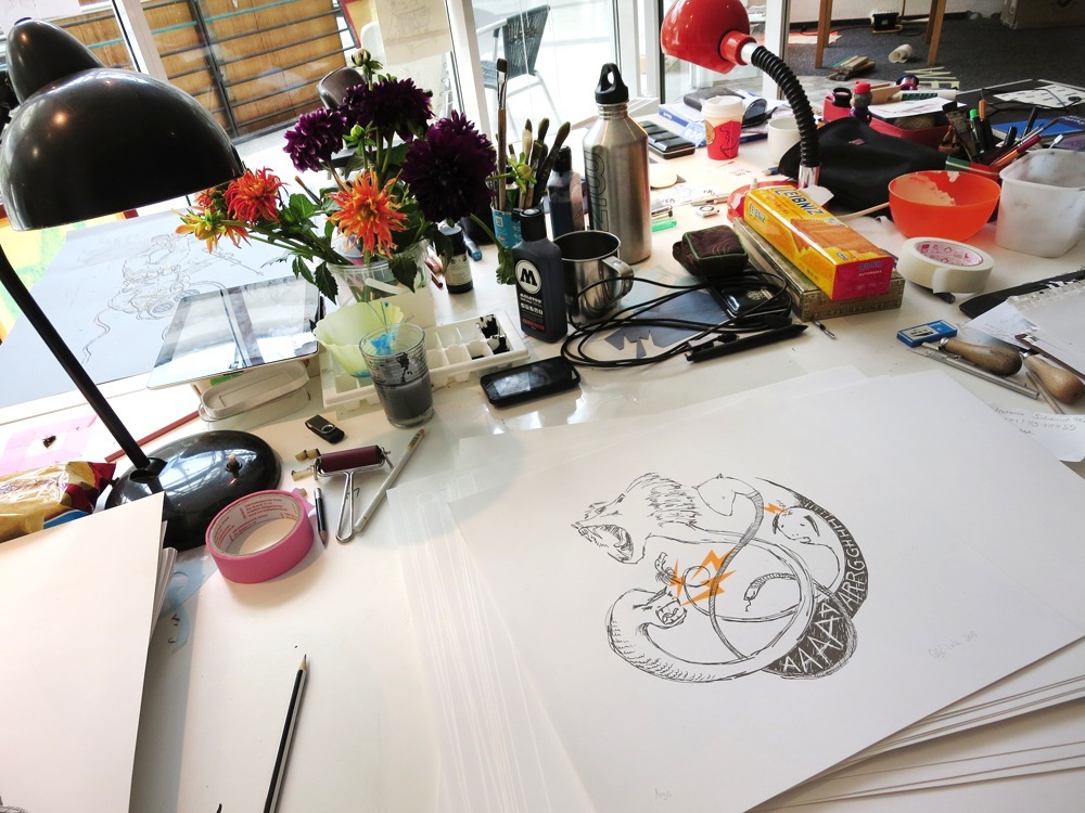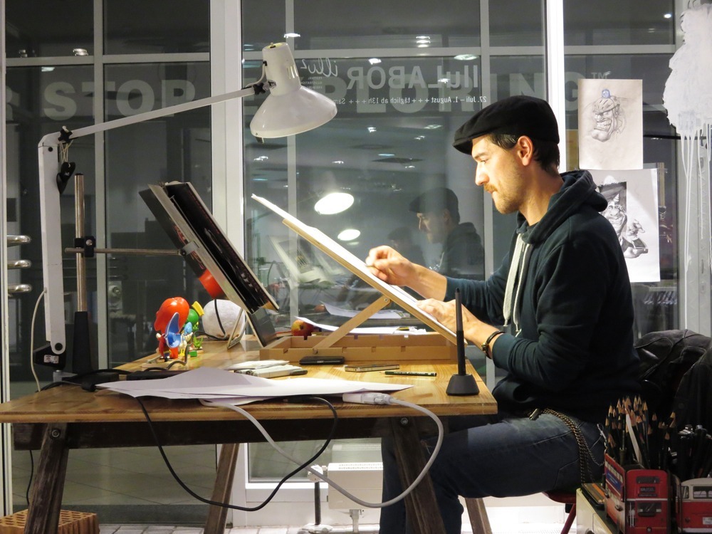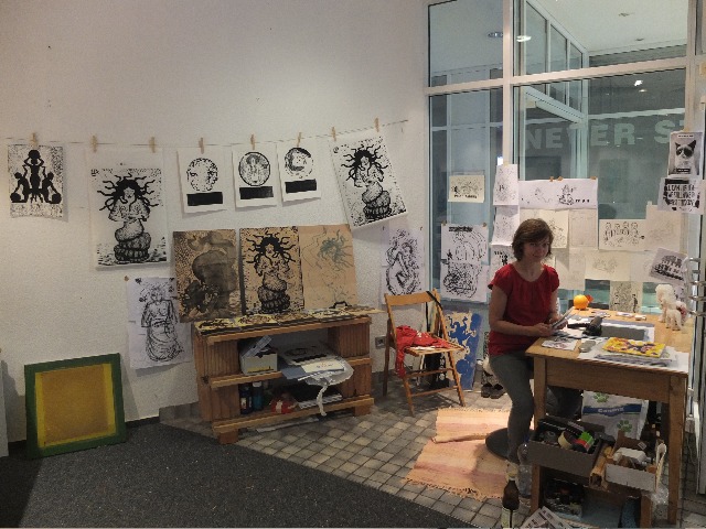Der öffentliche Workspace Illustration & Siebdruck, mit Woodbird, Café Lala, Frankenstoner, Ludmilla Bartscht, und Svenson lud ein zum reinschauen, diskutieren und den IllustratorInnen beim arbeiten zusehen.